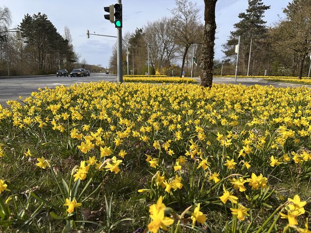 Auf Initiative des zuständigen Dezernats und Fachbereichs der Stadt Cuxhaven waren im Spätherbst 2025 Reviergärtner und Auszubildende ausgeschwärmt, um rund 100.000 Geophyten (Zwiebelblumen) - hauptsächlich Narzissen und Krokusse - zu pflanzen. Das Ergebnis ist jetzt besonders gut entlang der Theodor-Heuss-Allee sowie der Haydnstraße zu sehen, insbesondere in den drei Kreuzungsbereichen Drangstweg, Brockeswalder Chaussee und Feldweg.
