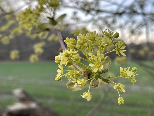 Am Montagmorgen (13. April 2026) war Anette Minners mit Drittklässlern der Ihlienworther Grundschule auf der Suche nach jetzt blühenden Wildkräutern wie Gundermann, Löwenzahn und Scharbockskraut. "Wir hatten dabei das Glück, zufällig auf einen Imker zu treffen, der den Kindern die großen und für Bienen besonders attraktiven Ahornblüten zeigte", berichtet sie. Noch sei es aber leider für die Bienen mit auch tagsüber anhaltenden einstelligen Temperaturen zu kalt, um sich davon wirklich zu bedienen.