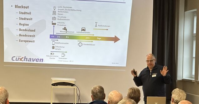 Mobilfunk und das (fast flächendeckend internetbasierte) Festnetz fielen innerhalb der nächsten 30 Minuten bis zwei Stunden aus. "Sie können dann keine Hilfe mehr holen oder Leute benachrichtigen", gab er zu bedenken. Weder die Tankstellen noch die Einkaufsmärkte in der Stadt Cuxhaven (bis auf zwei Ausnahmen) verfügten über eine Notstromversorgung. Nicht mal manuell lasse sich noch Treibstoff in die Fahrzeuge befördern. E-Autos fielen ebenso aus wie wasserstoffbetriebene Fahrzeuge, zu denen auch die kommunalen Müllfahrzeuge mit Wasserstoffantrieb gehören.