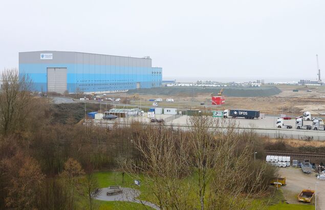 Von der Baumrönne aus ist derzeit besagtes Schotter-Plateau östlich der großen blauen "Halle 5" zu sehen. Das Plateau dient nicht nur als Lagerplatz, sondern - wohlgeplant als Synergie - verdichtet es zudem den Boden als ein wichtiger Schritt für die anschließend geplanten zwei weiteren großen Hallenneubauten für die Monopile-Fertigung.