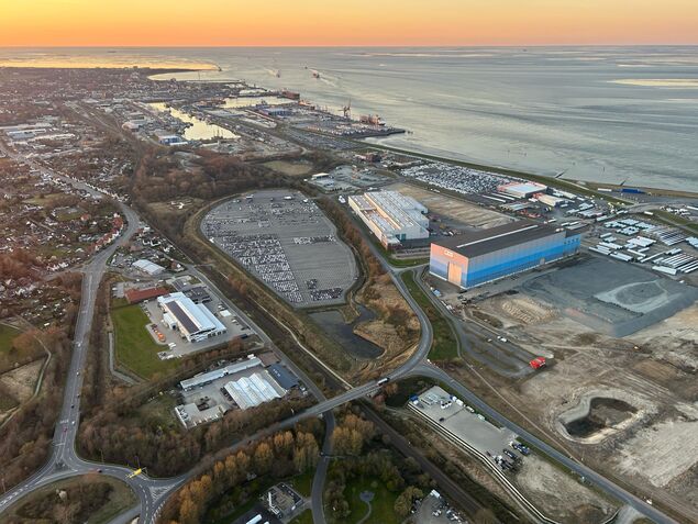 Neben der großen blauen "Halle 5" ist ein riesiger Schotterberg entstanden, aufgetürmt zu einem künstlichen etwa fünf Meter hohen Plateau. Titan Wind Energy (Germany) hat 2019 seine zukünftige Fertigungsstätte für Offshore-Wind Fundamente in Cuxhaven gekauft und damit den Grundstein für die Umsetzung der Vision und Strategie des Unternehmens im Offshore-Windgeschäft gelegt. Um die geplante Produktion von Monopiles ab Ende 2026 zu starten, wird derzeit intensiv rund um die markante "Halle 5" gearbeitet. Um die enormen Dimensionen dieses Projekts zu verdeutlichen, sind Luftaufnahmen entstanden, die zeigen, welche Fortschritte bereits gemacht wurden und zeitgleich erahnen lassen, welche Veränderungen in naher Zukunft folgen.