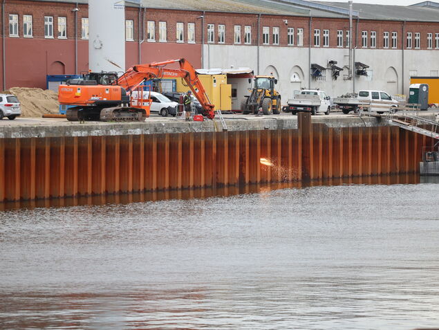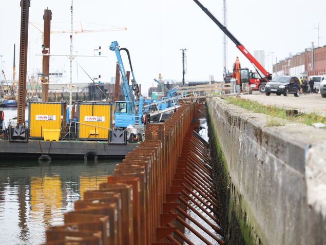 Die neuen Spundwände sind bereits nahezu vollständig rund um das Hafenbecken bis zu 22 Meter tief in den Boden gerüttelt worden. In einem nächsten Bauabschnitt wird der Bereich zwischen der alten Kaimauer und den neuen Profilen mit Sand verfüllt - dabei bleibt ausreichend Raum für die Verlegung von Strom- und Versorgungskabeln, unter anderem für die Stromsäulen der Krabbenkutter.