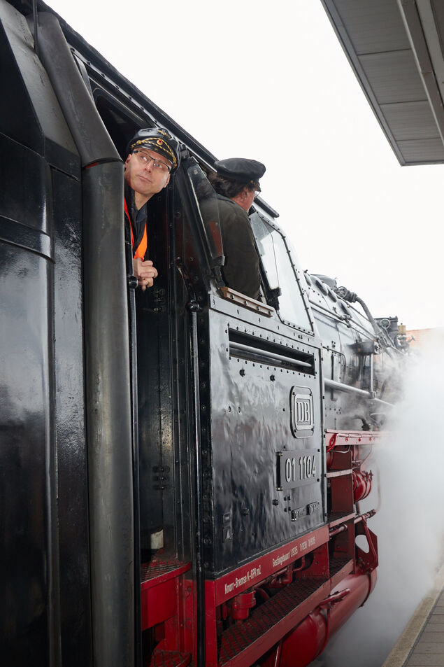 Ein Foto zu schießen, das die "01 1104" unter Dampf zeigt, war am Sonnabend zwar auch im Zielbahnhof Cuxhaven möglich. Die Lok, die einem Verein in Süddeutschland gehört, zischte und spotzte und stieß, sobald sie kurz anfuhr, ein Dampfwölkchen in den grau verhangenen Himmel. Einen richtigen Schweif zog die Dampffahne vermutlich erst bei Erreichen der Reisegeschwindigkeit, die mit 100 bis 110 km/h angegeben wurde. Sei's drum: Örtliche Trainspotter konnten den Nostalgiezug im Rangierbetrieb beobachten. Ein paar Dutzend Schaulustige harrten am Bahnsteigende aus, während Fahrgäste in Richtung Hafen aufbrachen. "Das Wasser sehen" und "ein Fischbrötchen essen" war das Tagesziel einiger gemeinsam reisender Paare aus Hamm in Westfalen.