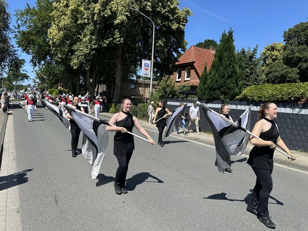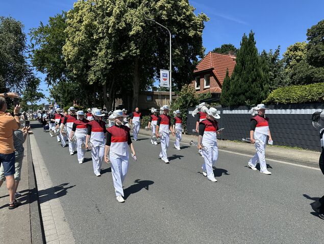 Der Umzug formierte sich in Höhe des früheren Helios-Seehospitals und setzte sich - an vielen geschmückten Vorgärten vorbei - in Richtung Schulhof in Bewegung. Die Showband "Spirit of 52" aus Rastede kündigte das Herannahen des Umzugs lange vorher an und lieferte imposante Bilder mit ihren Kostümen, Formationen und den Fahnenschwingerinnen. Vorweg fuhr Organisator Günther Wichert und animierte durch die offenen Seitenfenster die Gäste zum Mitklatschen und -feiern.