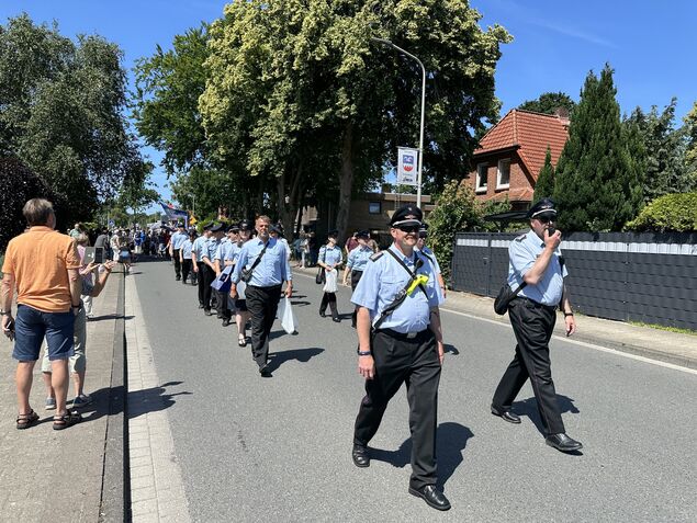 Wenn Sahlenburg schon mal ein solches Jubiläum feiert, kommt sogar der Verkehr auf der Nordheimstraße mal für eine Stunde zum Erliegen: Auf der plötzlich so leeren Verbindungsachse zum Strand zu laufen, war schon ein besonderes Gefühl für die Schaulustigen, die sich rechtzeitig einen guten Platz entlang der Strecke sichern wollten. Überall standen sie in Grüppchen zusammen und warteten auf die Wagen und Fußgängergruppen.