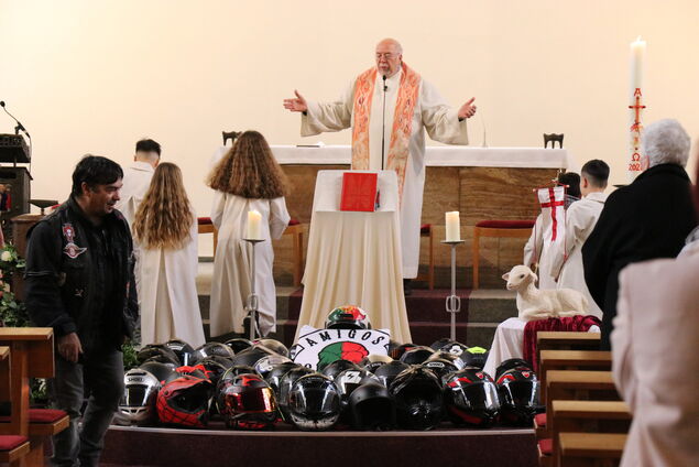 Vor dem Altar hatten die Zweiradpiloten symbolisch ihre Helme niedergelegt. Sie wurden ebenso gesegnet wie ihre Maschinen draußen, als Zeichen für Schutz, Achtsamkeit und eine unfallfreie Fahrt. In ihrem Gebet baten die Anwesenden um Bewahrung auf allen Wegen und erinnerten zugleich an jene, die nicht mehr zurückgekehrt sind.