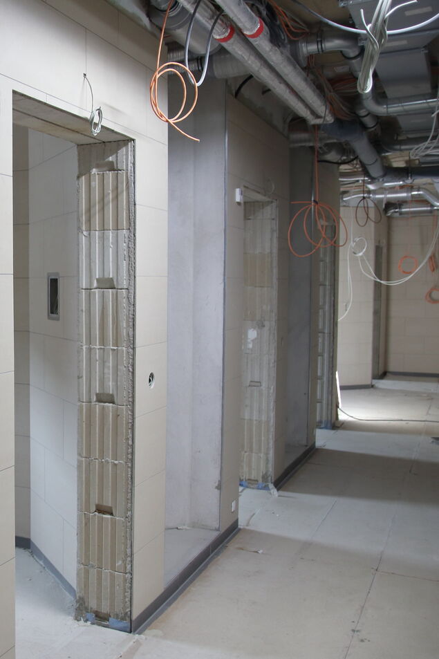 Dass dieser Trakt (anders als im Bestandsbau) abseits der gewöhnlichen Laufwege liegt, ist aus Sicht der Uniformierten ein Vorteil. Als maßgebliche Erleichterung wird vermutlich das künftige Platzangebot wahrgenommen werden: Die beengten Verhältnisse, unter denen Polizistinnen und Polizisten am Standort Cuxhaven ihren Dienst versehen, gaben den Ausschlag für das beschriebene Investment, auf dessen Umsetzung man aufgrund von leeren Kassen und höher priorisierten Vorhaben etliche Jahre gewartet hat. Energetisch spielt der Erweiterungsneubau in einer anderen Liga, moderne Sanitärräume, Umkleiden und ein Sozialraum sollen für ein zeitgemäßes Arbeitsumfeld sorgen. Standards, die im Zuge der noch ausstehenden Sanierung auch in einen rundum erneuerten Altbau einziehen sollen. Man wolle, das hoben die Vertreter der Polizei während des Baustellenrundgangs hervor, unter Kollegen auf keinen Fall eine Zweiklassengesellschaft schaffen.