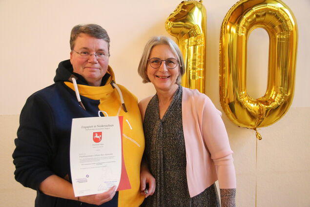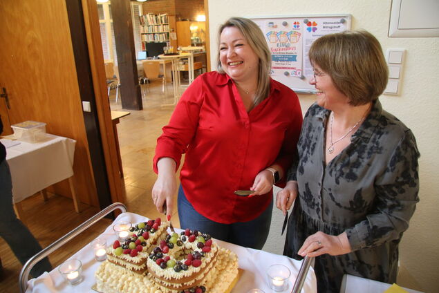 Musikalisch umrahmte Sängerin Yuliia Sevostianova den Nachmittag mit Liedern von Schumann und Verdi sowie einem ukrainischen Volkslied. Pastor i. R. Achim Wolff, der das OHA von der ersten Stunde an begleitet hatte, gab den Dank, der ihm zuteilgeworden war, sogleich zurück: "Ohne eure Ideen und Zuversicht wäre das alles nichts geworden. Ich durfte immer Ja sagen - niemals Nein." OHA-Koordinatorin Mirjam Schneider überreichte gemeinsam mit Silke Karallus Urkunden des Landes Niedersachsen an neunundvierzig aktive Ehrenamtliche - "Das ist doch fantastisch", sagte sie strahlend. Den süßesten Beitrag leistete Konditorin Elena Balabukha, die gemeinsam mit Dolmetscherin Svetlana Neuendorf die Geburtstagstorte anschnitt und verteilte. Nach Gruppenfoto, Quiz und Verlosung endete die Feierstunde offiziell um halb sechs - doch viele blieben noch lange. Das offene Herz Altenwalde hat eben nicht zu.