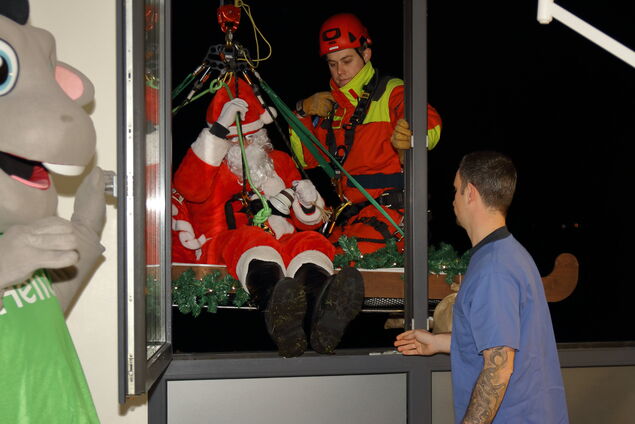 Nicht nur Patienten, auch Teile des Klinikpersonals verfolgten die filmreife Szene, die am Sonnabend im Übrigen bereits in einer zweiten Variante zu bewundern war. Premiere sei im Vorjahr gewesen, berichtete Klinik-Pressesprecherin Katharina Recht: Damals wurde der Nikolaus vom Dach des Krankenhausgebäudes auf die Kinderstation abgeseilt.