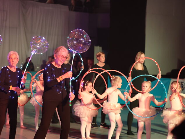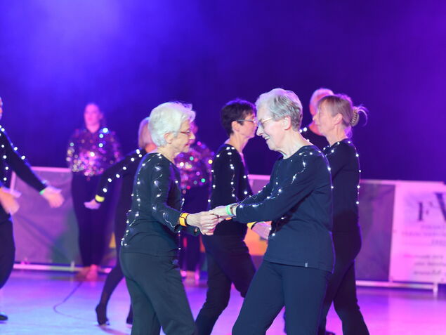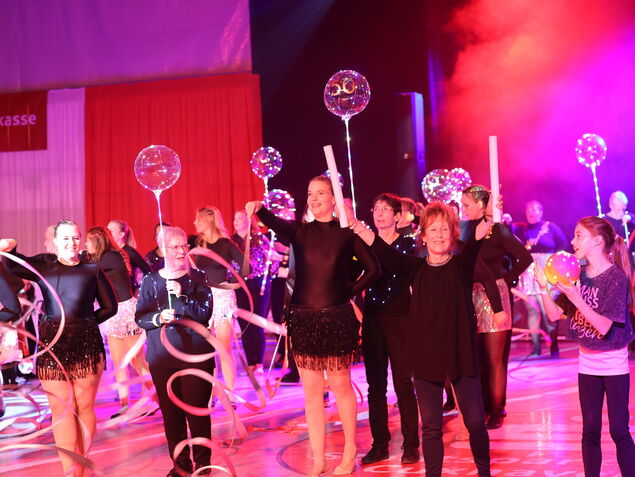 Die Mitwirkenden (zwei bis 86 Jahre alt) lieferten zu Hits aus 50 Jahren eine glitzernde Show ab, die für alle einen Platz im Rampenlicht bot. Die Kleinsten zeigten selbstgebastelte Jubiläumslaternen und Gymnastinnen warfen Bänder, während die Trainerin vom Rand dirigierte, das Publikum zum Klatschen animierte und zeitweilig selbst mittanzte.
