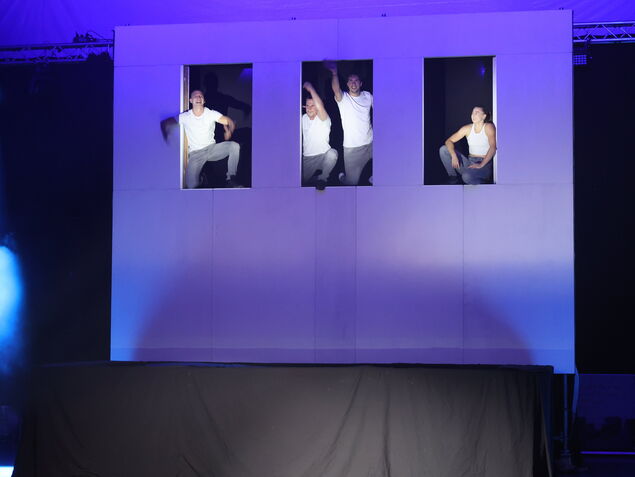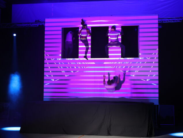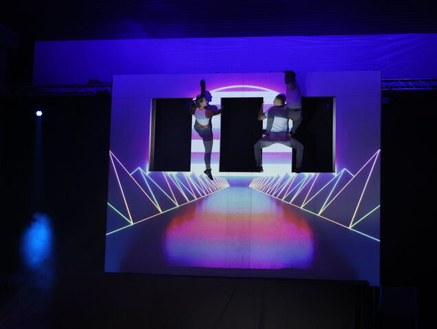 Ebenfalls sonst in den großen Arenen zu sehen ist die "Mapping Tramphouse Show" der Cosmic Artists. Die vier Trampolinakrobaten - unter ihnen eine Frau - katapultierten sich vom Trampolin an eine durch Videoeffekte in Szene gesetzte Hauswand und kamen sich dabei trotz rasanten Tempos nicht in die Quere.