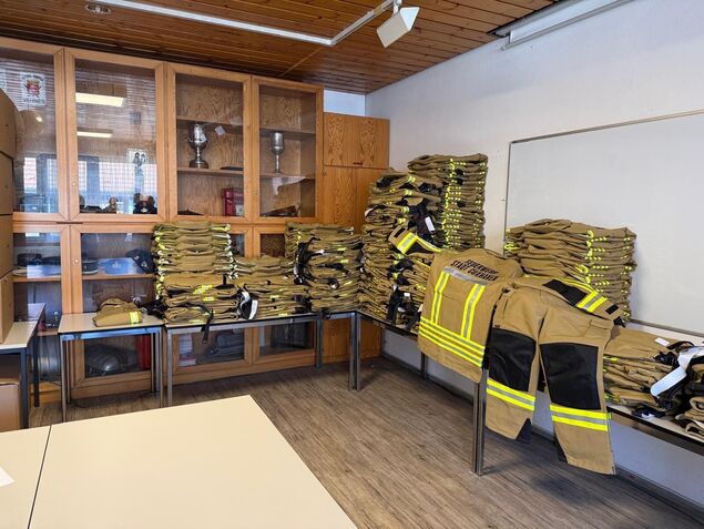 Thomas Pfeiffer, Wachabteilungsleiter bei der Berufsfeuerwehr Cuxhaven und Mitglied der Freiwilligen Feuerwehr Sahlenburg, und Schirrmeister Andreas Kunitzsch, begleiteten die Übergabe zusammen mit einem Vertreter der Herstellerfirma. Eine Garnitur - Paketpreis rund 1100 Euro - besteht aus Jacke und Hose. Die neue Einsatzkleidung ersetzt die abgängige Kleidung in den Ortsfeuerwehren der Stadt. In großen Behältern wurde die durch Einsätze und Aufbereitung strapazierte ausgediente Schutzkleidung gesammelt.