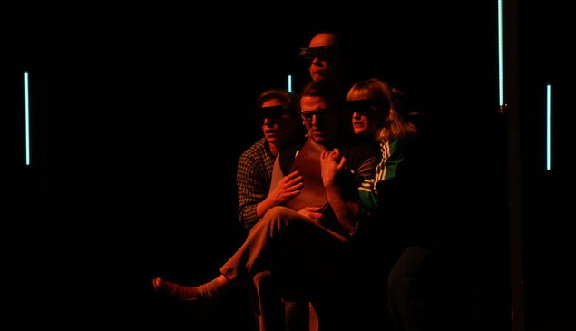 Schon vor Beginn des Stücks ließ das offene Bühnenbild (Jörg Zysik) erahnen, dass hier mit Reduktion und Symbolik gearbeitet wird: Drei Spielpodeste, ein skelettartiges Pavillon-Gerüst, an dem moderne Leuchtröhren installiert sind, und ein großer, wandelbarer Tisch schufen einen Raum, der sich je nach Lichtstimmung und Inszenierungsidee in immer neue Räume verwandelte. Zusätzlich wurden zwei schwenkbare Mikrofone geschickt als Telefon, Durchsage- oder Erzählinstrument genutzt - ein minimalistisches, aber eindrucksvolles Bühnenkonzept.