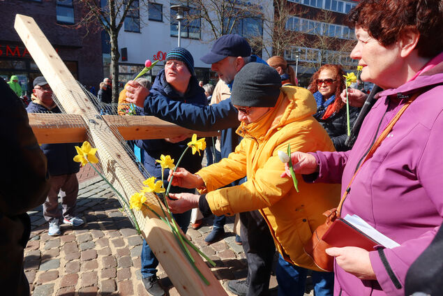 Am Ende der Aktion veränderte sich das Bild. Das Kreuz, das zuvor nackt und schwer gewirkt hatte, wurde von den Teilnehmenden geschmückt. Mit Osterglocken und Tulpen, Zeichen der Schöpfung. Die Blüten leuchteten - zart und doch kraftvoll. Aus dem Kreuz wurde ein "Garten des Lebens", wie Uli Flottmann es ausdrückte. Ein Zeichen dafür, dass in aller Dunkelheit auch Leben ist - und dass die Macht des Todes nicht das letzte Wort behält.