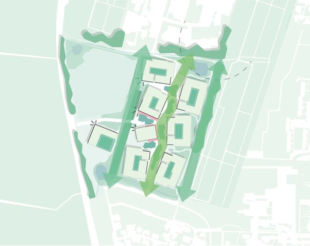 Der Entwurf setzt auf sechs Wohnhöfe unterschiedlicher Prägung, gruppiert aus Geschosswohnungsbau, Reihen- und Einfamilienhäusern. Die Höfe sollen Gemeinschaft stiften - halb privat, halb öffentlich, mit Raum für nachbarschaftliches Leben. Dazu ein großer, durchgehender Freiraum in der Mitte, der den Charakter des Marschlandes aufnimmt.