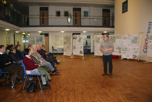 - Eine Besucherin wollte wissen, wie Radverkehr und Fußwege angebunden werden. "Wir vernetzen das Quartier mit den bestehenden Wegen - aus Norden, Süden, Osten. Hinter dem Hub beginnt ein autoarmer Raum", so der Dortmunder Stadtplaner. Andreas Eickmann ergänzt: "Das ist für Cuxhaven ein Novum. Aber wir müssen in der Verkehrswende endlich mitmachen. Stellplätze sollen nicht mehr überall im Straßenraum stehen."