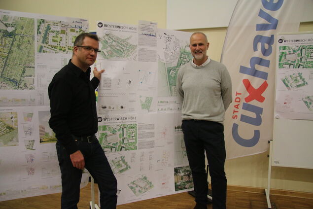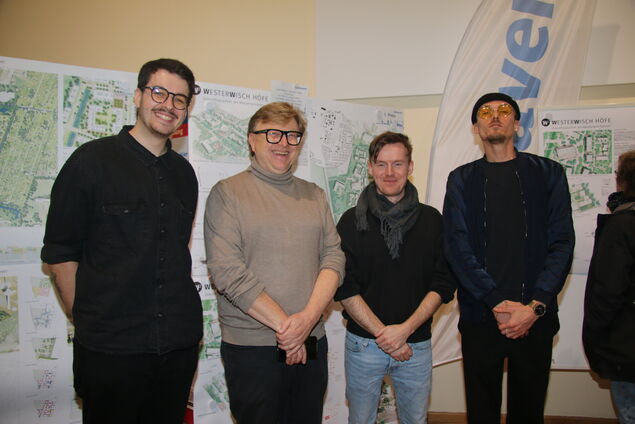 Drei Vertreter dieses Teams nahmen in der Bürgerhalle den Ball auf - leidenschaftlich, kenntnisreich, mit Lust am Risiko. Stadtplaner David Fabibunke, Kollege Malte Meil und Landschaftsarchitekt Marcel Spieß rückten den Entwurf "Westerwisch-Höfe" ins Licht - ein Quartier, das sich bewusst gegen die übliche Kästchenarchitektur wendet. "Wir wollten nicht das nächste austauschbare Wohngebiet bauen. Dieser Ort hat die Chance, einen Schritt in die Zukunft zu wagen", sagt Fabibunke.