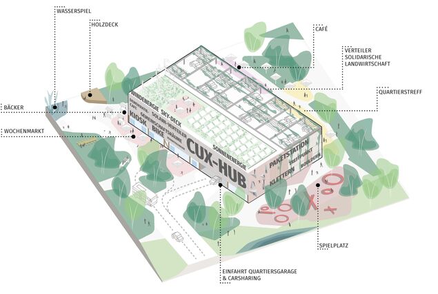 Herzstück der Mobilität ist der Quartiers-Hub, von den Planern als "Cux-Hub" bezeichnet. Autos fahren hin, nicht hinein. "Das Gebiet bleibt befahrbar - aber nicht dominierend. Wir wollen ein Straßenbild, das den Menschen gehört", sagt Fabibunke.