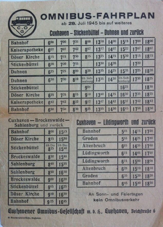 1925 (vor 100 Jahren): 16. Januar: Start für die "Cuxhavener Omnibus-Gesellschaft (COG). 4. Juni: Erstes Kurkonzert im Musikpavillon Grimmershörn, 22. Juli: Neue Volksbadeanstalt am Schleusenpriel.